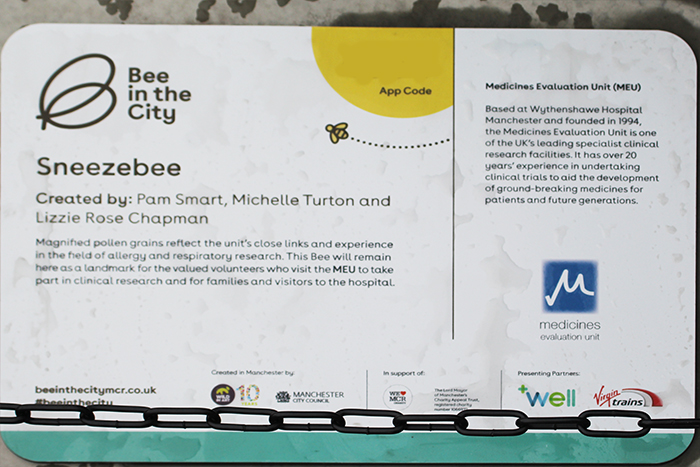 This Bee In The City sits outside Wythenshawe Hospital, near the entrance to the Medicines Evaluation Unit, and is decorated with great attention to detail. If there was an award for the most beautiful eyes on any of the 101 bees, Sneezebee has to be in the running.